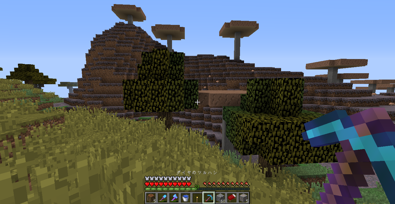 さて、せっかくキノコバイオームを見つけたのでシルクタッチ装備を持ってきて菌糸を取ることにしました!