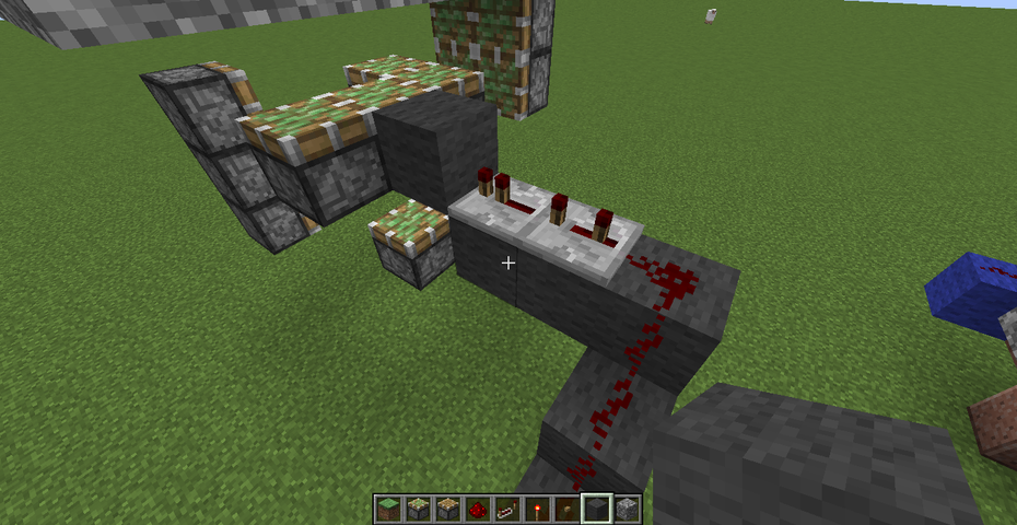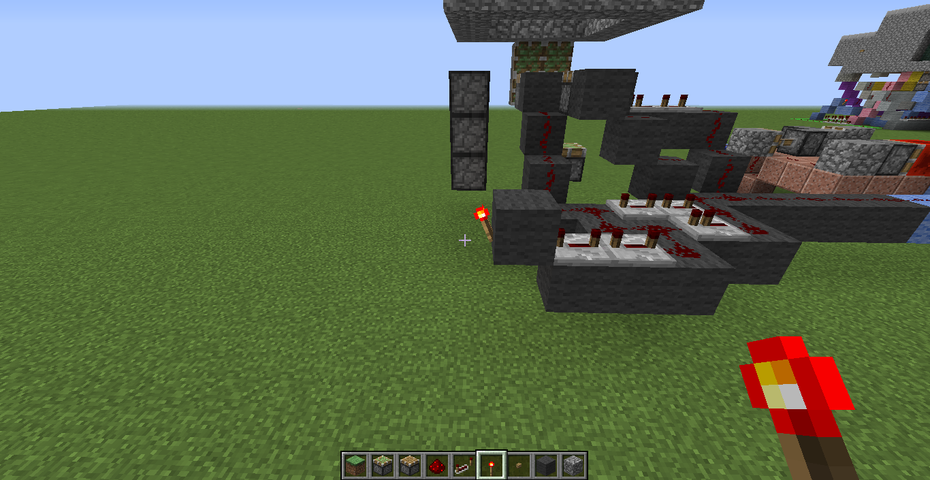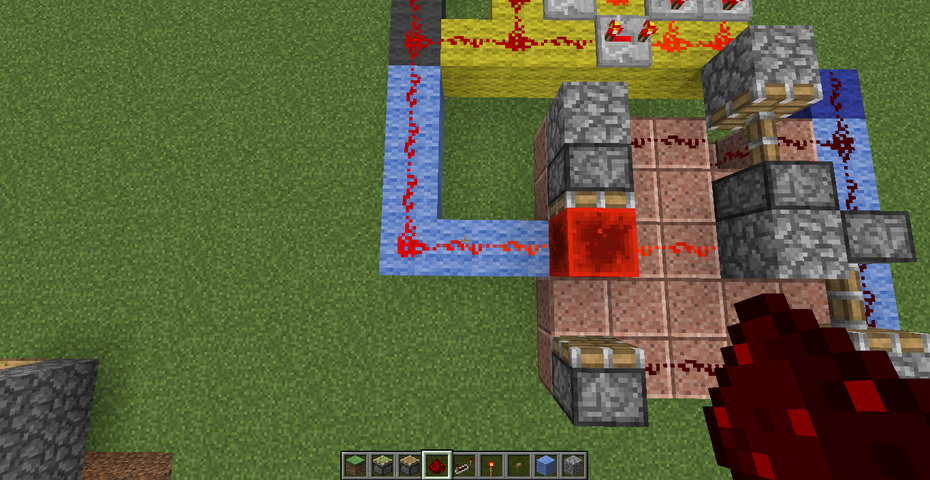 (前回の回路記事でも書いた通り、回路を通す土台は分かりやすさを求めて色付き羊毛で作っていますが、実際に作る際は丸石などの通常のブロックで作っても一切問題ありません)