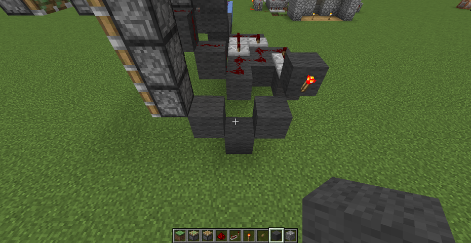 また、粘着ピストンの脇の赤石トーチの上にブロックを置き、その上に赤石を置きます。
